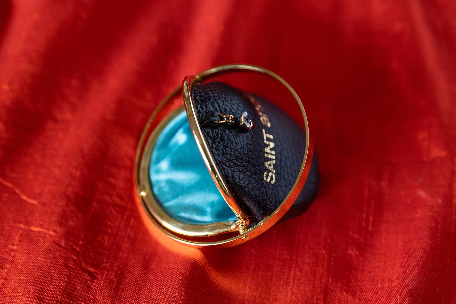 まるで地球儀のような、丸い形が特徴のがまぐちポーチ。