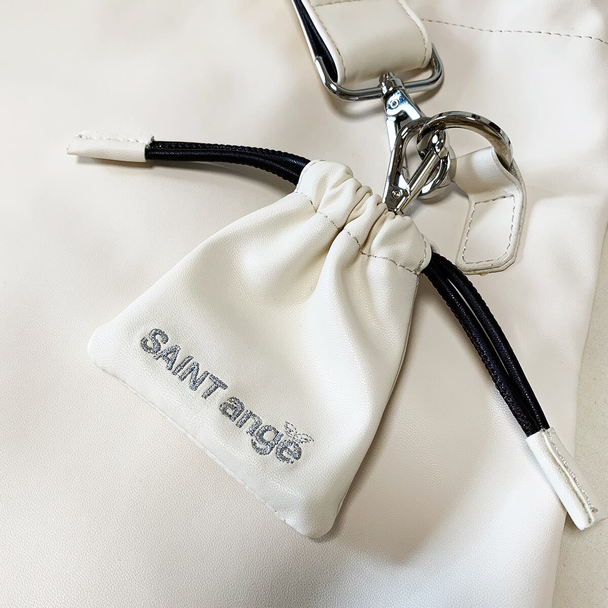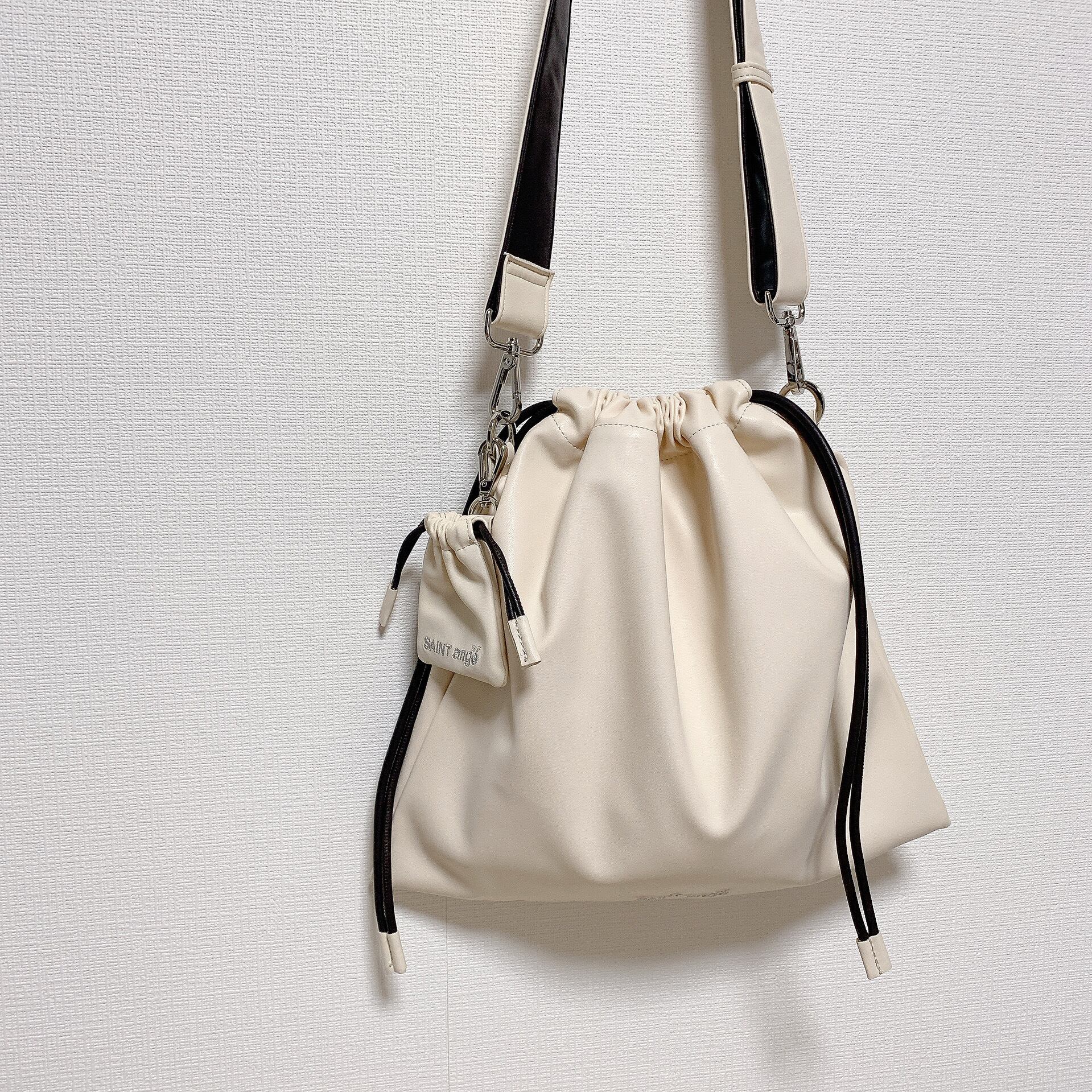 肌触りの良いシープスキンのような合皮素材を使用した、上品な巾着ショルダーバッグ。そのまま小さくしたミニ巾着チャームがポイントで、カジュアルなコーディネートにぴったりです。シルバーの刺繍が施されており、シンプルながらも存在感があります。