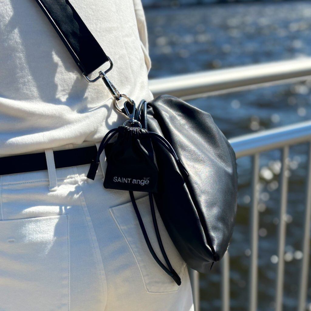 肌触りの良いシープスキンのような合皮素材を使用した、上品な巾着ショルダーバッグ。そのまま小さくしたミニ巾着チャームがポイントで、カジュアルなコーディネートにぴったりです。ゴールドの刺繍が施されており、シンプルながらも存在感があります。