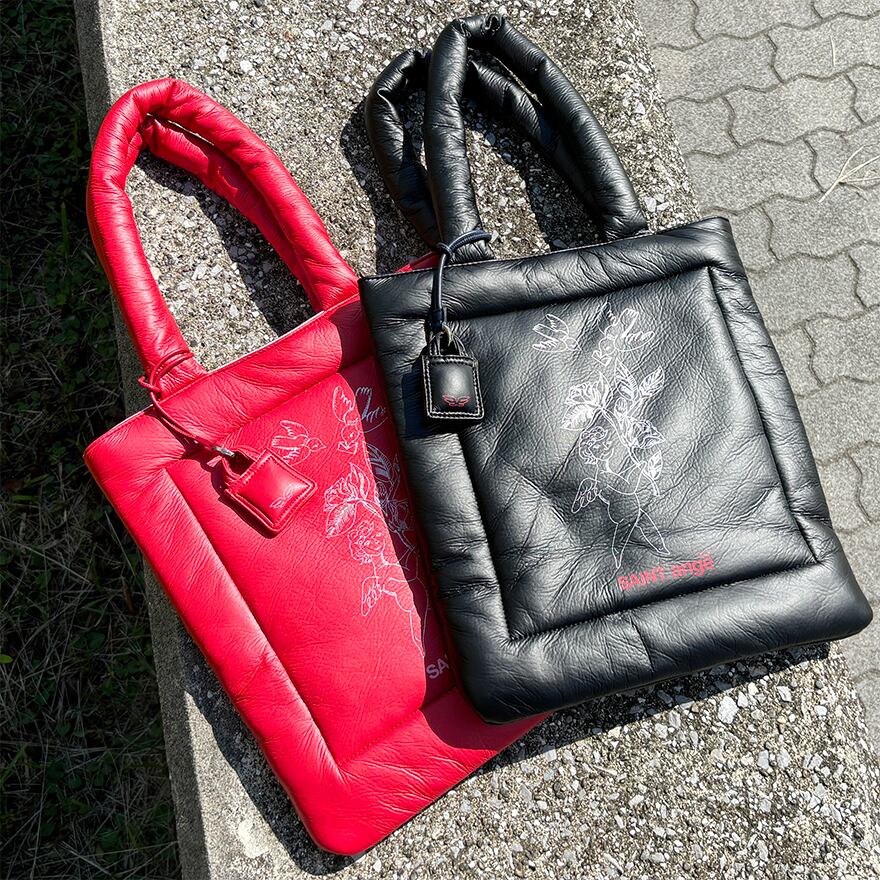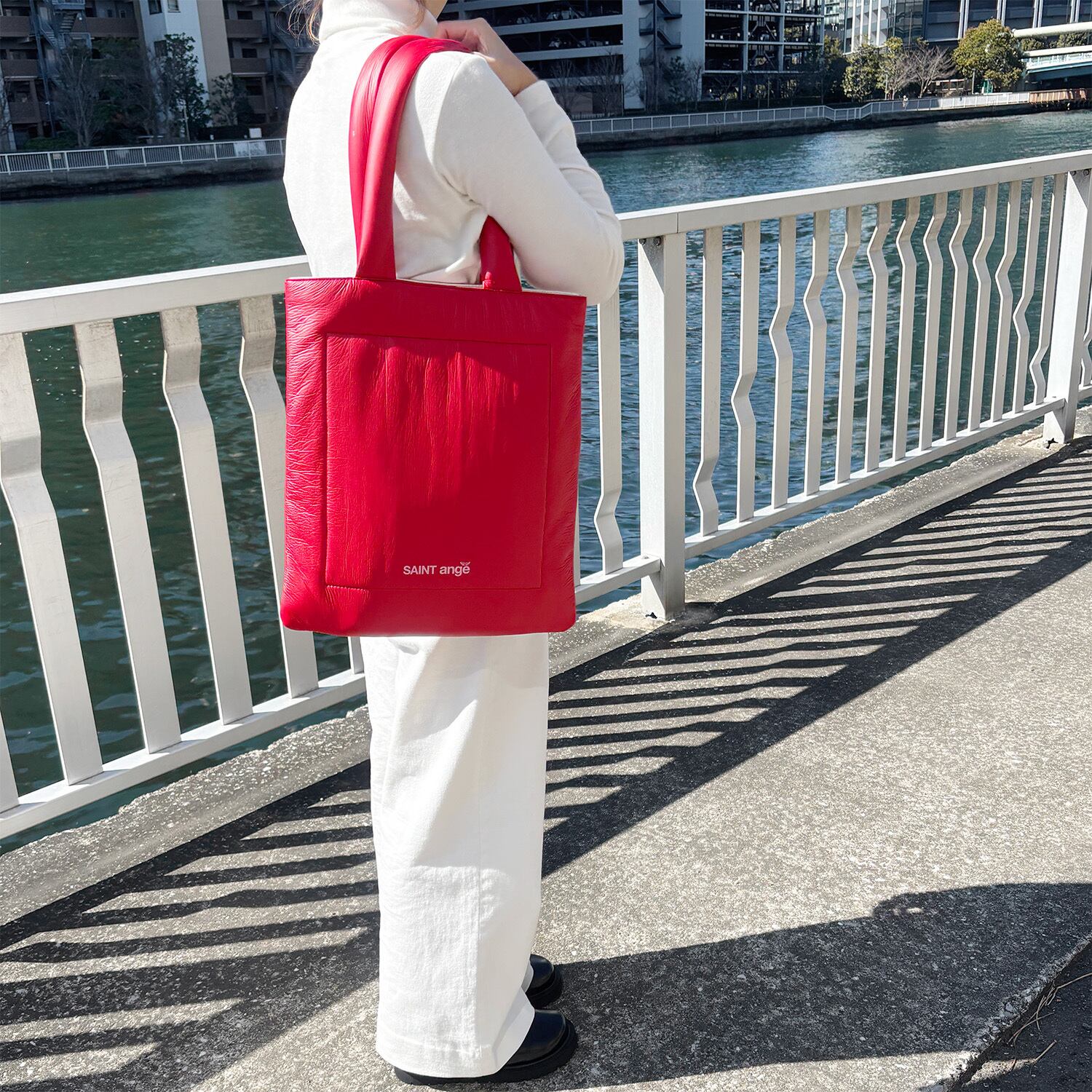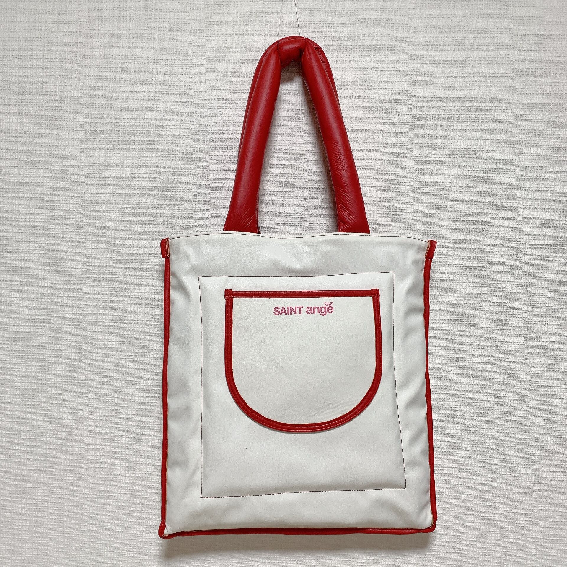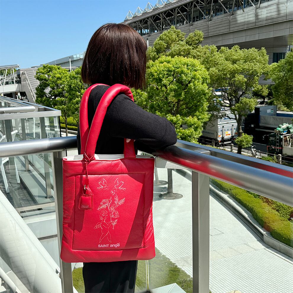 表面は中綿入りのふわふわした合皮とは思えない軽やかな素材、裏面はシープスキンのような肌触りの良い合皮素材を使用した、両面使用可能なトートバッグ。軽やかさと機能性を兼ね備えており、様々なコーディネートにマッチする万能アイテム。大胆なアンジュちゃんのプリントが施されており、着こなしのアクセントになります。